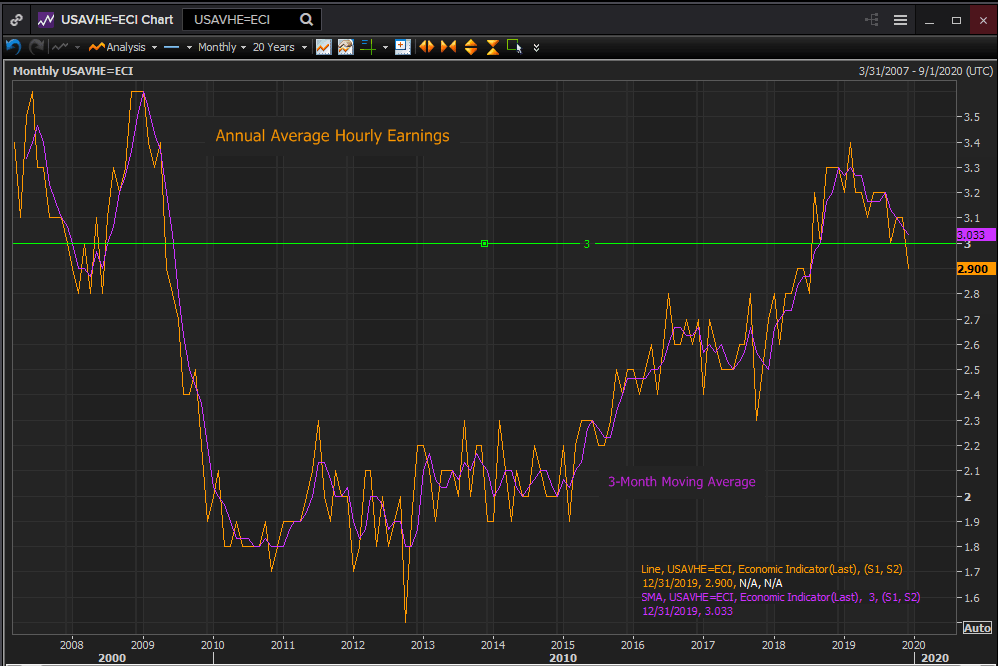 Average annual wage gains were 3% or higher for 16 months from September 2018 to November 2019, the longest span in the series which goes back to March 2007. Earnings fell to 2.9% in December.