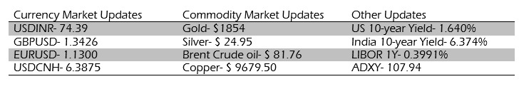US October retail sales came in much better than expected. Industrial Production and capacity utilization data too were encouraging. This suggests that the US is much ahead of other Developed market economies as far as recovery is concerned. The output gap has almost closed. The data has reinforced the market's belief that the Fed is behind the curve. Fed member Bullard's comments were extremely hawkish. He said that the Fed should be more hawkish and should start balance sheet runoff immediately after tapering ends (i.e. the Fed should start reducing its balance sheet size by not reinvesting when existing treasury securities mature). Strong data and hawkish comments have translated into higher US nominal yields and Dollar strength, especially against low-yielding currencies. Euro has continued its decline against the Dollar as policy divergence seems imminent. 1.1250 is the next crucial support for the Euro. High Beta commodity currencies and EM currencies too have weakened against the Dollar. The Sterling has managed to hold on to its support at 1.34 as UK economic data and BoE governor Bailey's hawkish comments caused short-term UK gilt yields to spike.