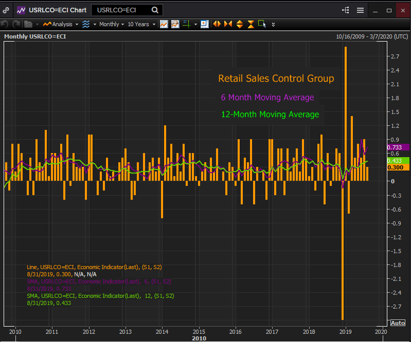 The control group category which is used by the BEA to calculate the consumption component of GDP averaged 0.733% from March through August. If the September prediction is accurate at 0.3% the 6-month average will fall to 0.55% but even so it would still be the highest score for the five years to this June.