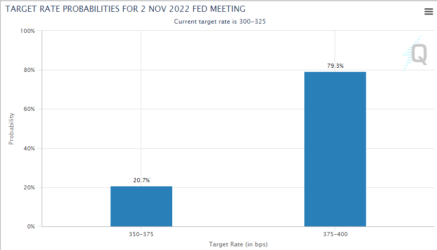 - Markets are pricing in an 80% probability of a 75 basis points Fed rate hike next month.