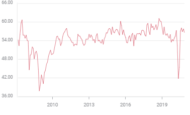 Since the recovery began in earnest in June economists have had difficulty judging the the amount of new business being generated. The manufacturing index has averaged 63.1 from June and has beaten its consensus estimate by an average of 14.8 points each month.