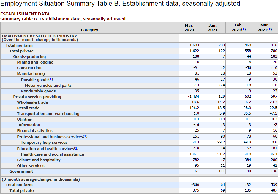 - Nonfarm Payrolls March increase at 916,000 largest since August 2020.