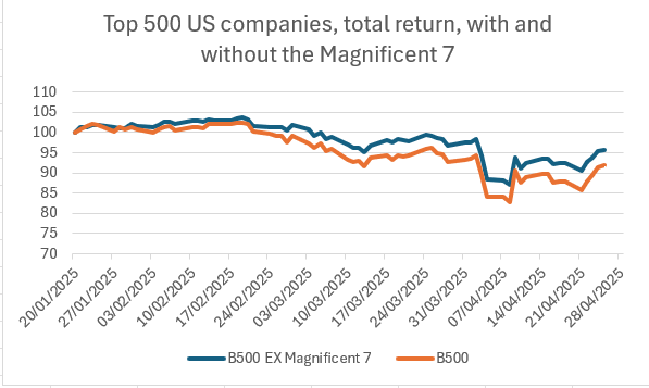 The fall in US markets contrasts with the performance of other major indices, with markets in Europe outperforming US stocks over the same time period. The dollar has also fared poorly against most major currencies, falling more than 9% on a broad basis since Trump took office. The main losers in the sell off in US markets have been the tech giants that make up the Magnificent Seven. The chart below shows the total return performance of the largest US 500 companies, both with and without the Magnificent Seven. For most of this year, the Magnificent Seven has been a drag on the overall US index, which is a big change from last year.