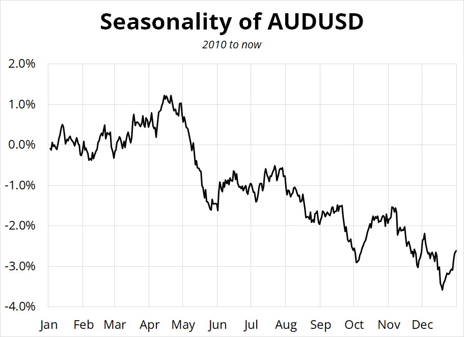 A good trade idea would be to sell a 1-month 0.6611 one touch in AUDUSD for around 62%. AIt feels like AUD above 0.68 would require something Herculean at this point. The next chart shows seasonality of FX vol. While I would normally scorn the use of percentage of a percentage charts, this chart of CVIX seasonality is still useful as a guide to general direction of FX vol over the course of the year. August and September are tough months to be long carry, short vol, or long risky assets.
