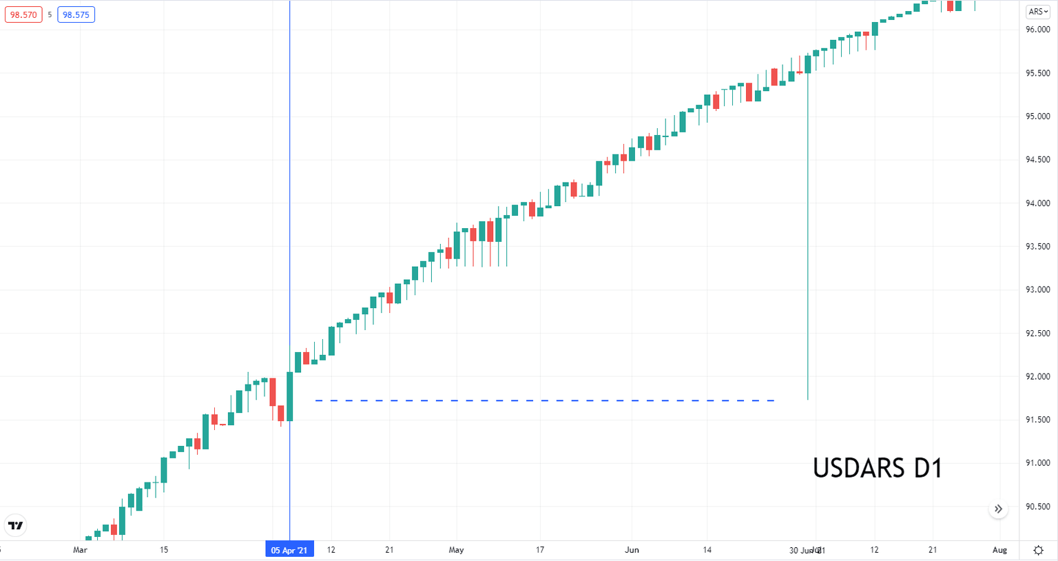 On June 30, 2021, A flash crash in the USDARS saw the pair briefly trade at a low of 91.73, equalling a -4% drop from the open price of the USD. However, the pair eventually settled 0.21% higher by the end of the trading day. The Argentine Peso was only granted a short spell of good fortune.