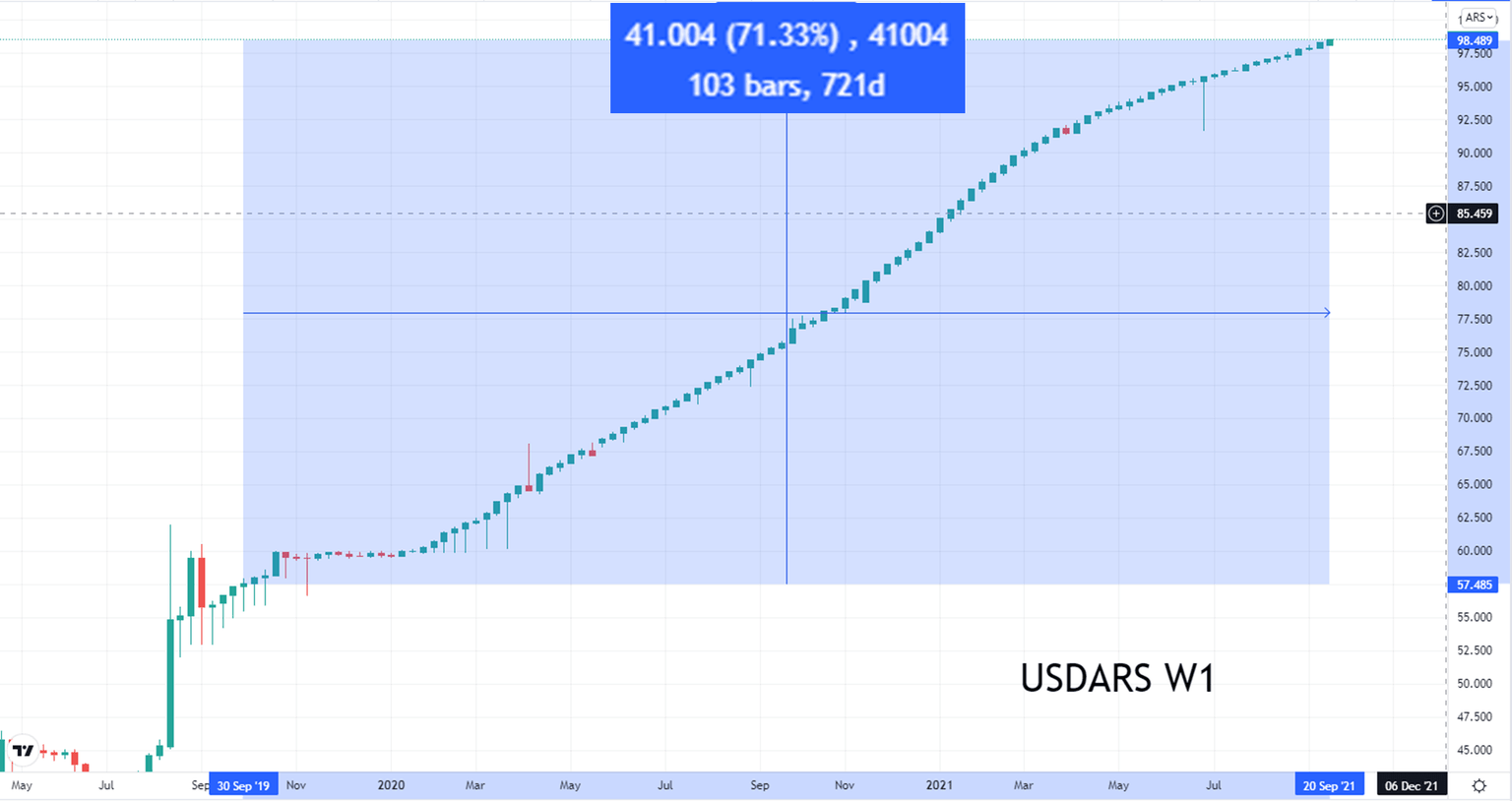 The Argentine Peso has lost 71% of its value against the US Dollar in the past two years. At the end of September 2019, the US Dollar / Argentine Peso (USDARS) closed at a trading price of 57.54. As we close in on the back of September 2021, the official exchange rate is now approximately 98.5 Argentine Peso per USD.