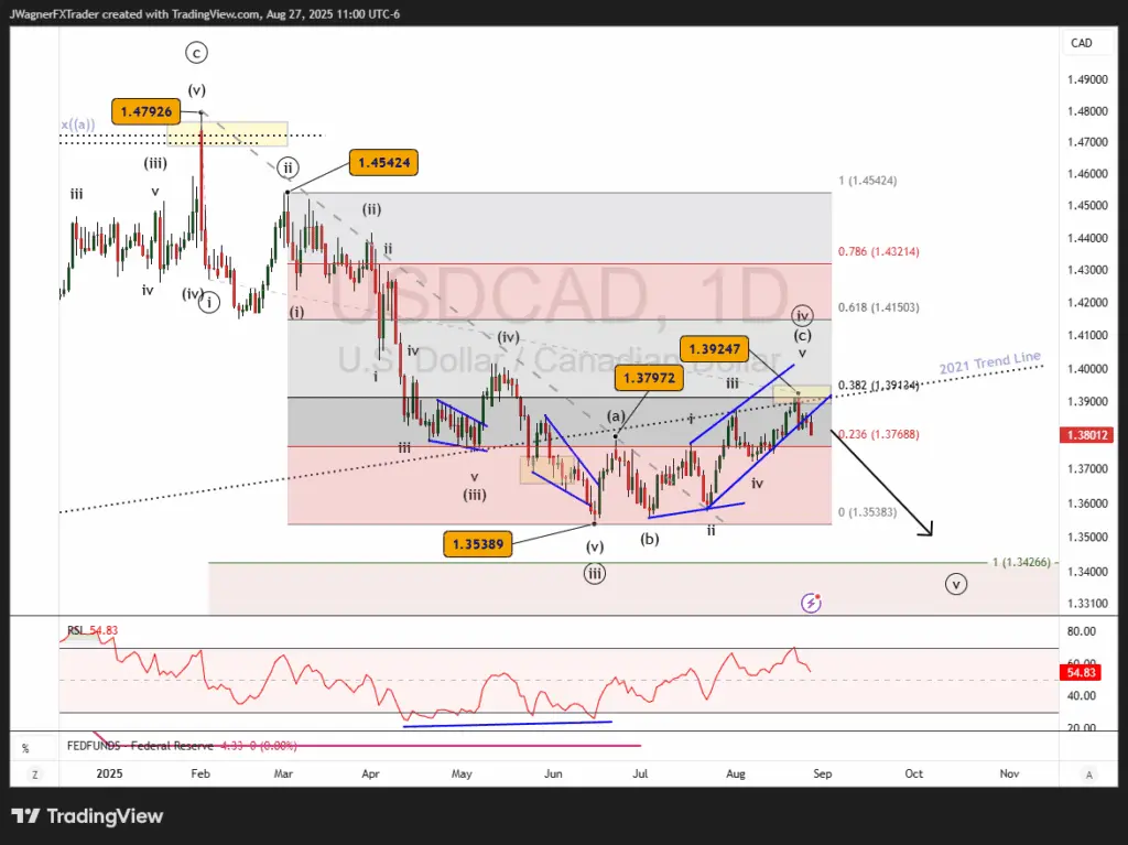 This implies an Elliott wave 5th wave lower that likely targets 1.3426. Using the Fibonacci extension tool, wave ((v)) would be 100% to wave ((i)) near 1.3426. Also, there is a September 2024 swing low near there at 1.3419 (not shown).