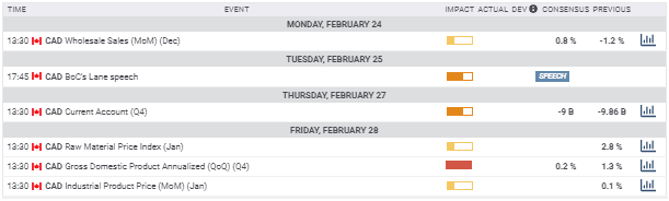 Fourth quarter GDP on Friday is forecast to drop to 0.2% from 1.3% in the third and 3.5% in the second. If accurate it will confirm the sharp slowdown in the Canadian economy at the end of the year and could undermine the loonie.