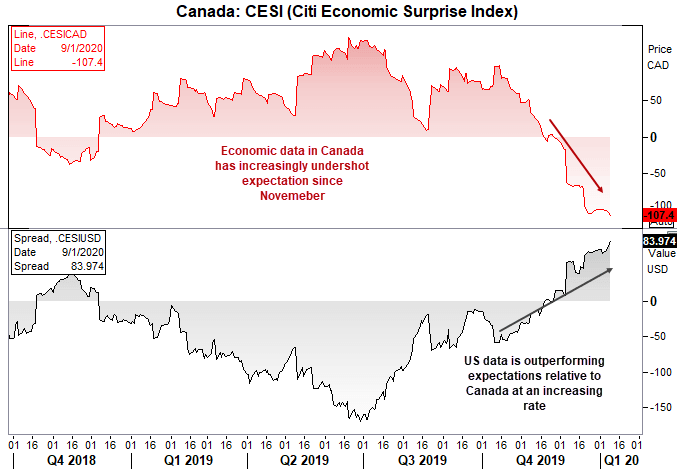 Data has generally undershot expectation for Canada since the end of November. Given BOC have a base rate of 1.75%, it appears to be only a matter of time before they’re forced to lower rates. Yet Poloz seems to think otherwise.