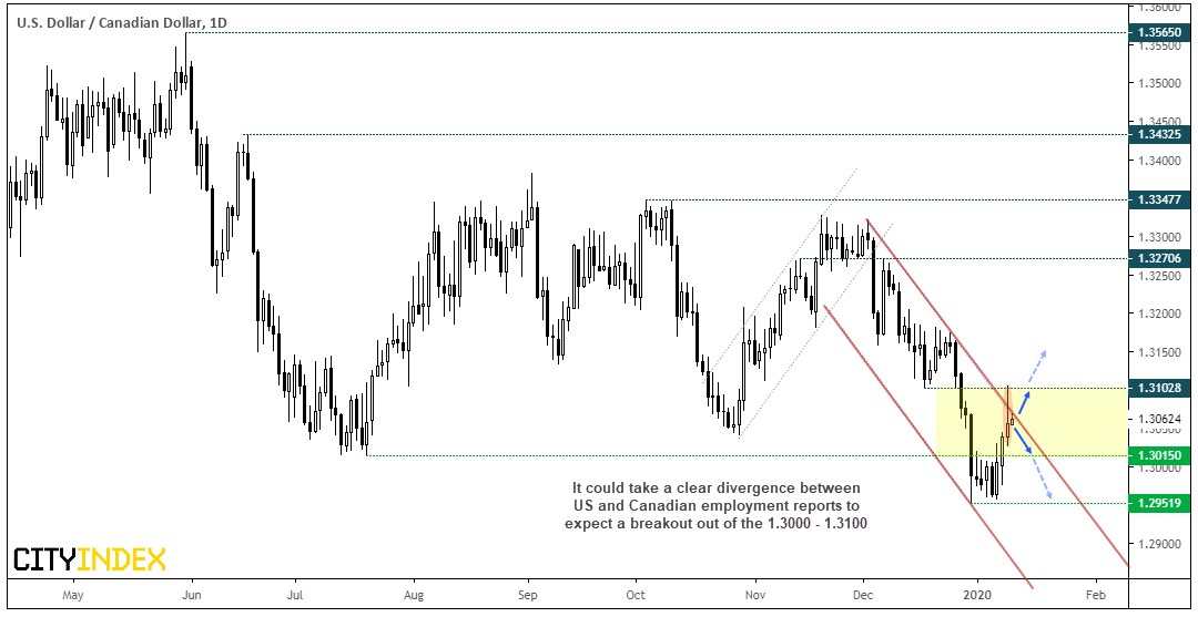 USD/CAD Daily: Wednesday’s close above the 2019 low showed that mean reversion was underway, with yesterday’s high breaching the December trendline and testing 1.3103 resistance. However, the bearish hammer closed beneath the trendline and shows a hesitancy to move higher ahead of today’s employment line-up. Trading around mid-way between 1.3000 – 1.3100, we could find prices remains between this zone if reports from US and Canada are mixed. It will therefore likely take a clear divergence between the US and Canadian employment reports to see the 1.3015 – 1.3100 range be broken today.