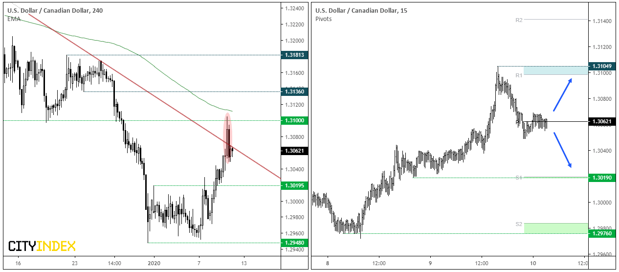 USD/CAD Intraday: A bearish engulfing candle / 2-bar reversal has formed on the 4-hour chart. The 1.3100 handle held and there’s also the 200-period eMA just above, so it could take a strong US beat and CA miss for these levels to break with conviction.