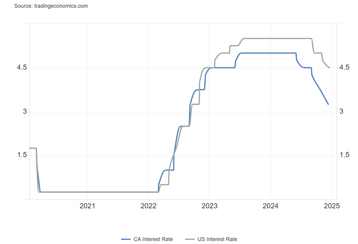 Canada’s interest rate now stands at 3.25%, still well above 2022’s rock bottom 0.25% but still far enough below the US’ fed funds rate, which only declined from 5.5% to 4.5% over the same period. The Fed held off on rate cuts much longer than the BoC, with the US central bank not delivering 2024’s first Fed rate cut until September.