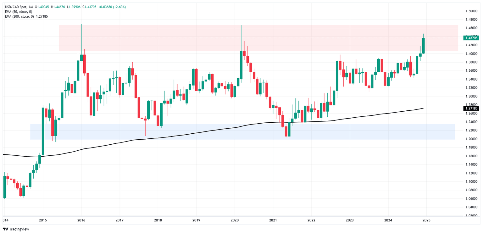 USD/CAD closed higher every month in 2024 except for three, gaining ground during the other nine. Despite the year’s one-sided chart action for USD/CAD, the pair is poised for a technical ceiling as bids struggle to pierce the key barrier decisively.