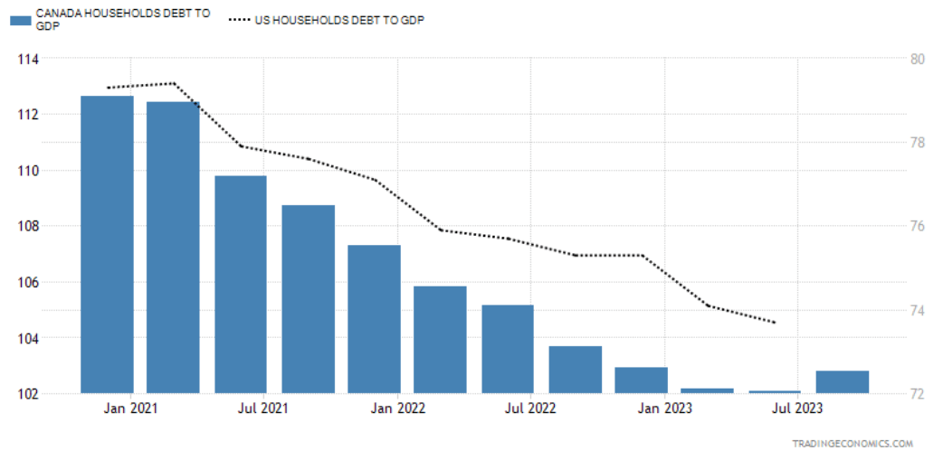 The US and Canada have both seen household debt as a ratio of GDP fall steadily in the past two years, but Canadian households remain exposed to economic downturn with consumer debt still measuring 103% of Canada’s GDP, compared to the US’ rate of private debt to GDP sinking below 74% in the second quarter of 2023.