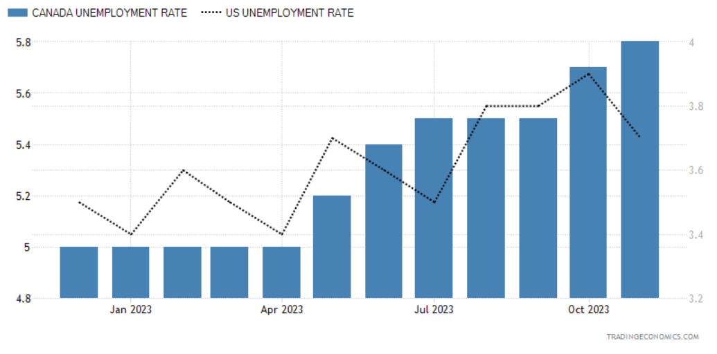 The US unemployment rate, while higher than it was this time last year, remains well below the structural level of unemployment, barely above 3.6% while the Canadian jobless rate continued to climb through 2023, approaching 6% at November’s print. US GDP growth remains relatively robust while Canada’s growth rate has ground to a halt, edging into negative territory in 2023’s fourth quarter.