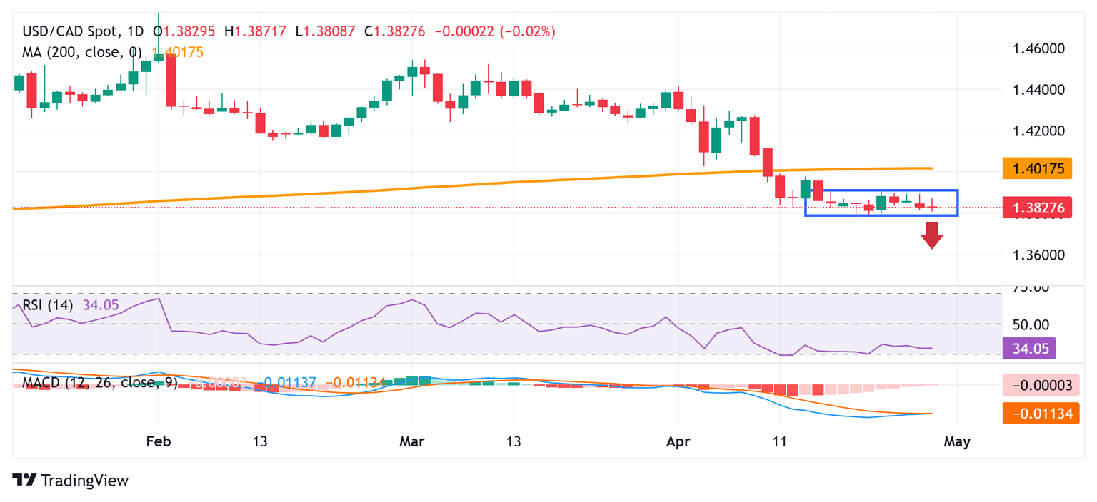The USD/CAD pair lacks any firm intraday direction on Tuesday and seesaws between tepid gains/minor losses through the early European session as traders digest Canadian election results. Multiple reports indicated that the incumbent Prime Minister Mark Carney’s Liberal Party won a tightly contested election held on Monday for the historic fourth term. However, Liberals fell short of the 172 seats required for an outright majority in the parliament and would need to rely on one or more smaller parties to form a government, and pass legislation. Nevertheless, the outcome strengthens Canada's position in trade negotiations with the US, which, in turn, lends some support to the domestic currency and caps the pair's intraday move higher to the 1.3870 area.