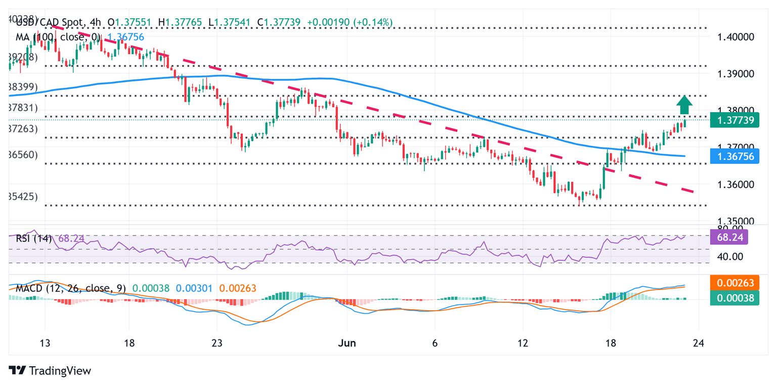 The USD/CAD pair is seen building on last week's goodish recovery move from the 1.3540 region, or the lowest level since September 2024, and gaining positive traction for the fifth consecutive day on Monday. The momentum lifts spot prices to the 1.3775 area, or over a three-week high during the first half of the European session, and is sponsored by a combination of factors. Against the backdrop of the Federal Reserve's (Fed) hawkish stance, rising geopolitical tensions in the Middle East seem to benefit the US Dollar's (USD) relative safe-haven status. Furthermore, a sharp intraday pullback in Crude Oil prices undermines the commodity-linked Loonie and acts as a tailwind for the pair.