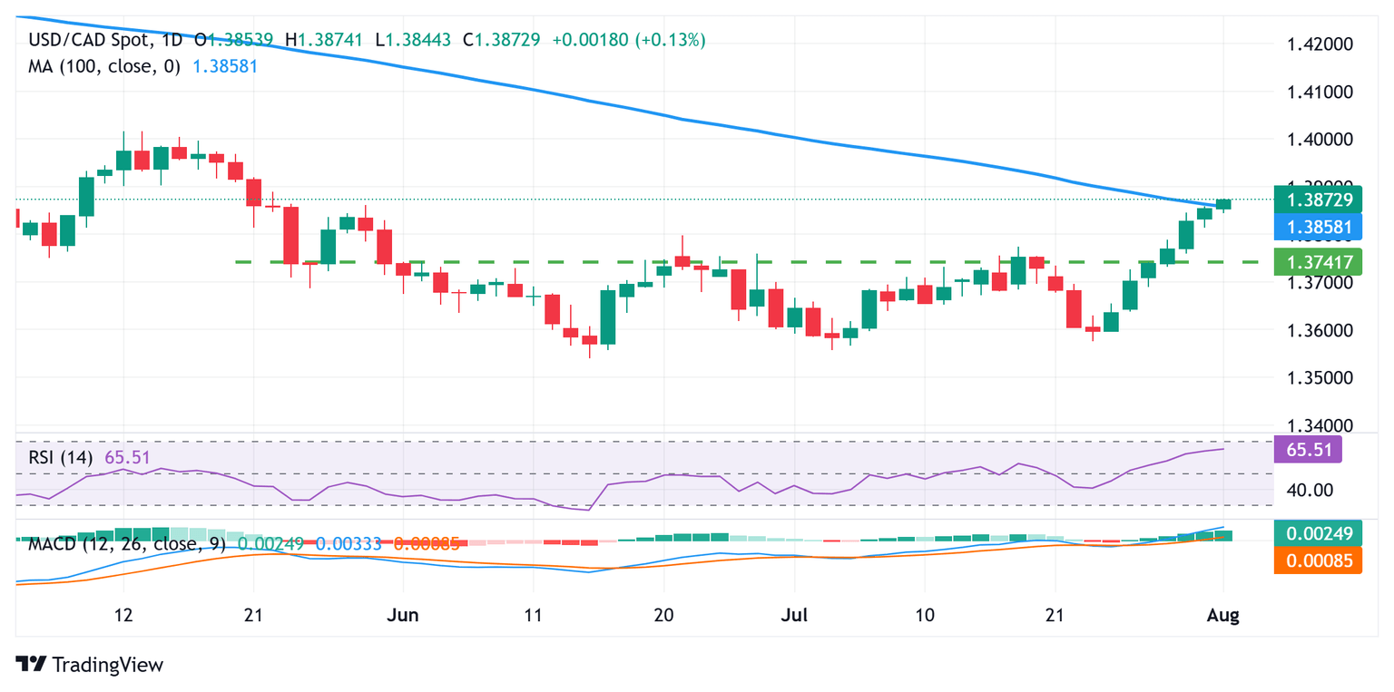 The USD/CAD pair prolongs its uptrend for the seventh consecutive day and climbs to its highest level since May 22, around the 1.3875 region during the first half of the European session on Friday. The Canadian Dollar (CAD) takes a hit in reaction to US President Donald Trump's executive order to raise tariffs on Canadian goods from 25% to 35%. The White House also announced a 40% transshipment tariff on goods rerouted through third countries to avoid the duties. Given that about 75% of Canada’s exports go to the US, the development dampens the outlook for Canadian exports and could weigh on the domestic economy. This comes on top of the Bank of Canada's (BoC) dovish pause earlier this week, which, along with subdued Crude Oil prices, continues to undermine the commodity-linked Loonie and acts as a tailwind for the currency pair.
