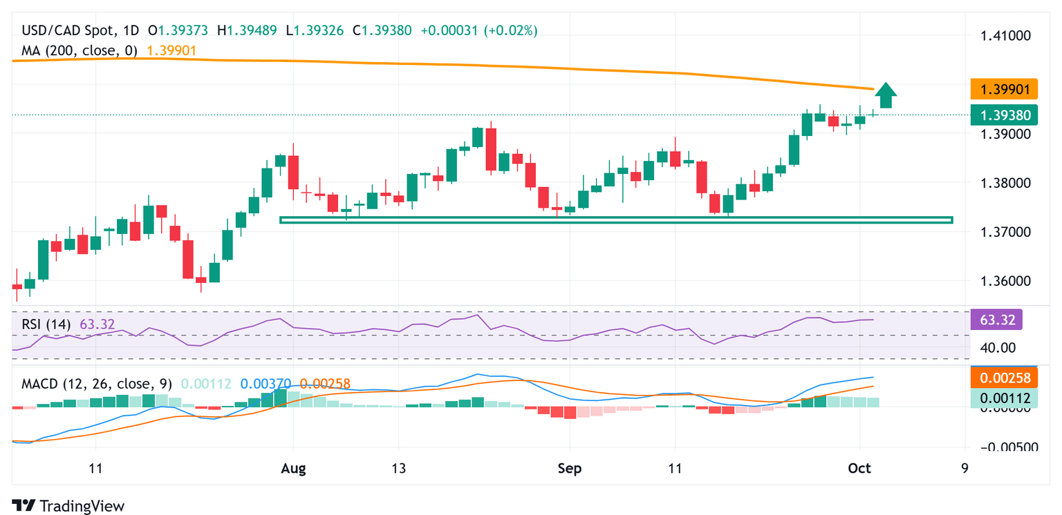 USD/CAD Price Forecast: Seems poised to surpass 200-day SMA, around 1.4000 mark