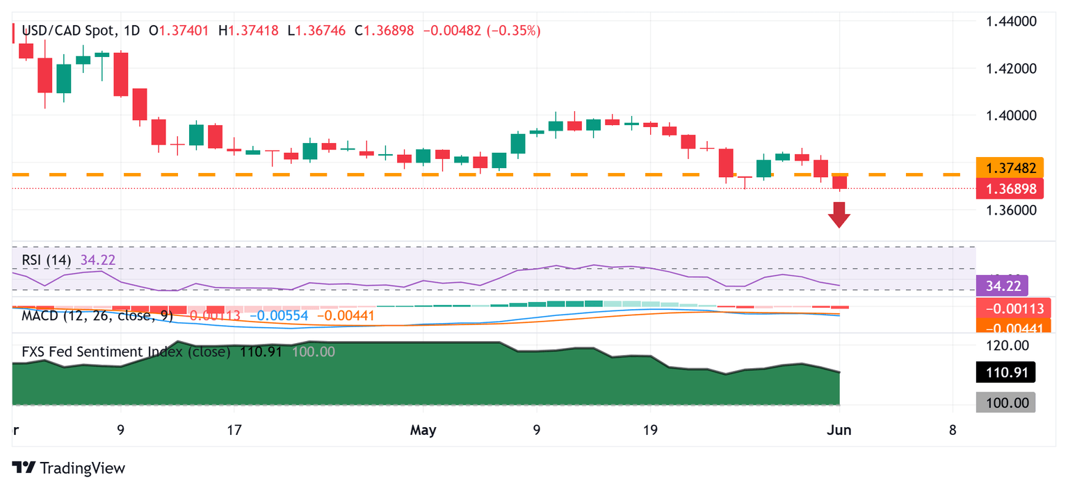 The USD/CAD pair continues losing ground for the third consecutive day and drops to the 1.3680 region, or a fresh year-to-date low during the early part of the European session on Monday. Crude Oil prices rallied in reaction to the OPEC+ decision over the weekend to increase output in July by the same amount as it did in each of the prior two months. Adding to this, low levels of US fuel inventories have stoked supply jitters heading into what’s considered the start of the US driving season and further act as a tailwind for the black liquid. This, in turn, is seen underpinning the commodity-linked Loonie, which, along with the emergence of fresh selling around the US Dollar (USD), exerts additional pressure on the currency pair.