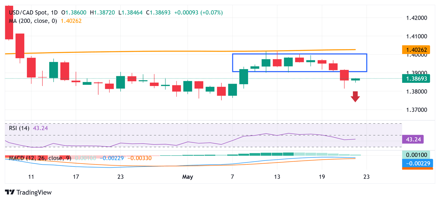 From a technical perspective, Wednesday's breakdown below the 1.3900 round figure, or the lower end of a short-term trading range, was seen as a fresh trigger for bearish traders against the backdrop of the recent failures near the 200-day Simple Moving Average (SMA). Moreover, oscillators on the daily chart have just started gaining negative traction and validate the near-term negative outlook for the USD/CAD pair.