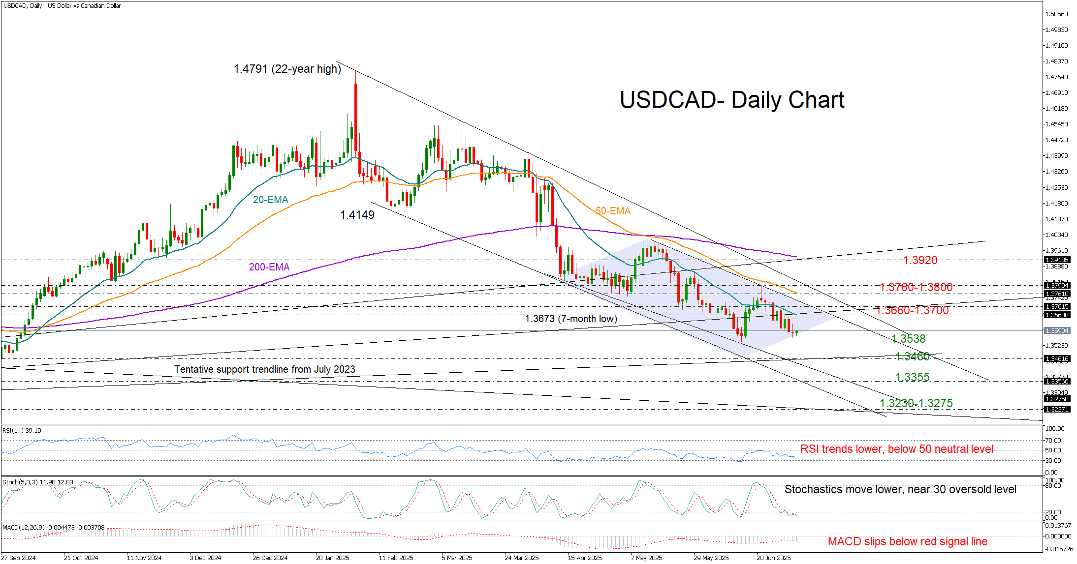 Technical indicators are clearly pointing downwards, flagging a potential downtrend extension below June’s low of 1.3538. In this scenario, the tentative support line from July 2023 could come to the rescue near 1.3455. If this level fails to hold, the decline may accelerate toward the 1.3355 support zone, which was last tested in January–February 2024. A further drop could target the 1.3230–1.3275 area.