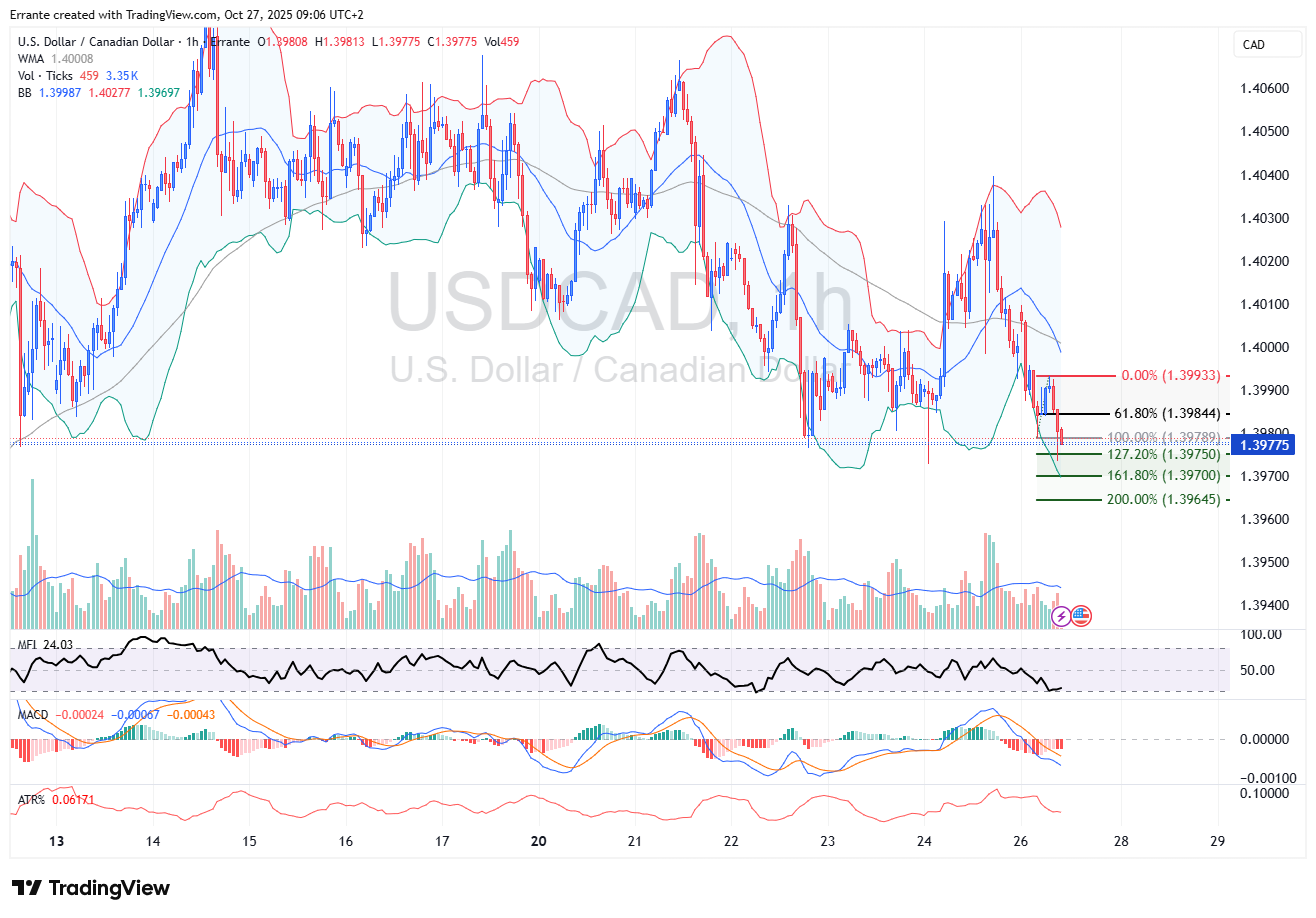 On the one-hour chart, USD/CAD is trading around 1.3977 after a weak European morning. The pair is tracking beneath the declining 50-period weighted moving average (WMA ~1.4001), with a sequence of lower highs and lower lows since last week’s spike toward 1.4040/1.4050. Price action has pressed into a Fibonacci cluster derived from the most recent intraday downswing: