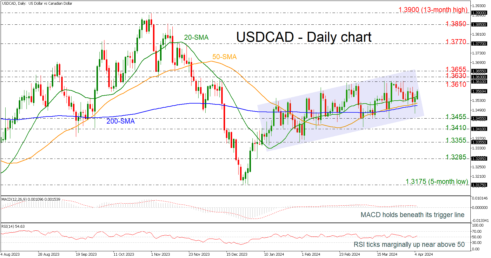 USDCAD is moving slightly higher following the rebound off the simple moving averages (SMAs), remaining within a short-term ascending channel.