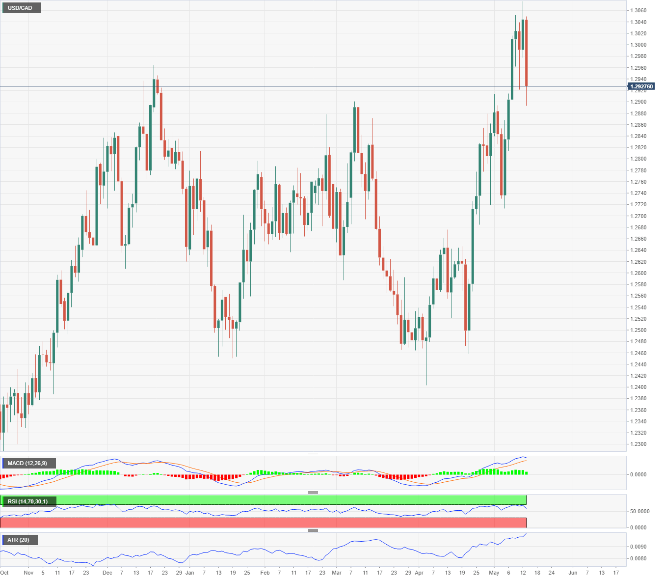 Despite the pullback to 1.2927 on Friday the MACD (Moving Average Convergence Divergence) is still in positive territory. The turn in the price line on Thursday should be watched for a cross of the signal line, a likely event if the pair continues south early in the week. The Relative Strength Index (RSI) changed direction toward neutral on Thursday. Volatility remains high in the Average True Range (ATR) with the USD/CAD level above 1.2900.