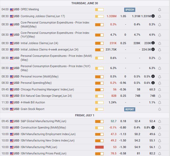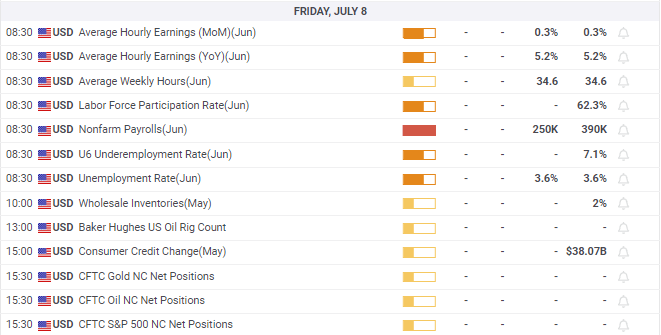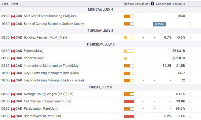Canada’s Net Change in Employment will accompany the NFP release. S&P Global Manufacturing and the Ivey PMIs for June will provide information but no market notice.