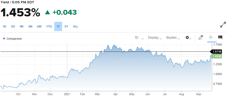 The 10-year Treasury yield added 14 basis points to close at 1.453%, its best level since July 1.