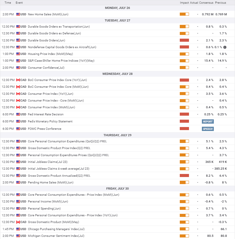 Traders will brace for a raft of key US economic releases on Thursday, including the US Q2 advance GDP report, Jobless Claims and Pending Home Sales. The US economy is likely to grow by 8.2% in Q2 vs. a 6.4% expansion reported in the previous quarter. Friday’s US Personal Consumption Expenditures - Price Index, the Fed’s preferred inflation gauge, UoM Consumer Sentiment and Canadian monthly GDP will hog the limelight, as a data-intensive week will draw to an end.