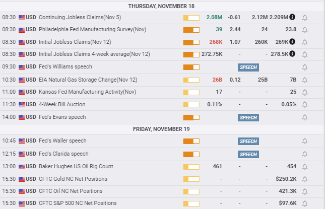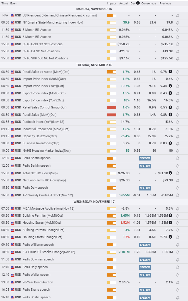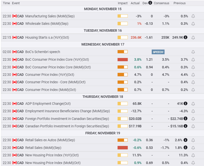 Canadian data was better than expected. September Retail Sales fell 0.6% instead of the estimated -1.7%. Inflation, as in the US, was hotter than predicted in October. Core CPI from the Bank of Canada (BOC) rose 3.8% on the year, up from 3.7% the prior month, topping the 3.5% forecast.