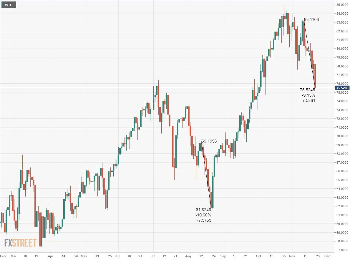 - WTI sheds 4.1% to $75.52, lowest close since October 4.