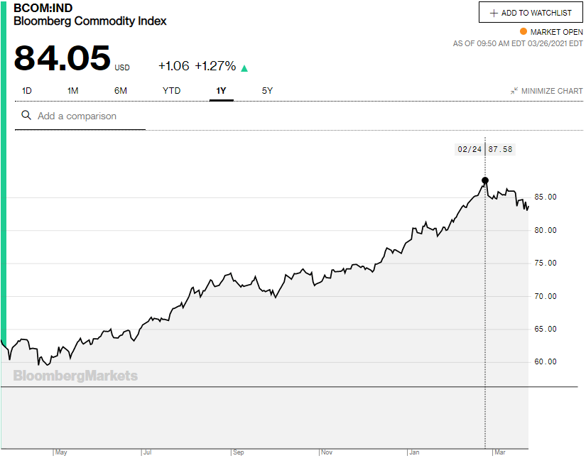 Since the February 24 high at 87.58 the index has dropped 4%. Commodity prices are one of the earliest indicators of an economic recovery, they are also one of quickest to reverse when growth is at hand.