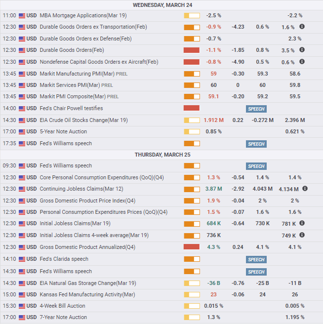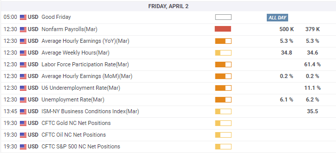 Nonfarm payrolls for March, 655,000 forecast, February 379,000. Unemployment Rate 6.0% expected, 6.2% February. Average Hourly Earnings expected 0.1% monthly, 4.6% annually. Underemployment Rate February 11.1%. Labor Force Participation Rate February 61.4%. Average Weekly Hours expected 34.7, February 34.6.