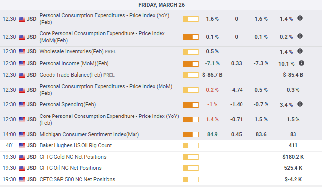 The PCE Price Index rose 0.2% on the month and 1.6% on the year in February from 0.3% and 1.4% in January. Core PCE Prices rose 0.1% and 1.4% from 0.3% and 1.5% in January. Personal Income fell 7.1% after January's 10.1% gain. Personal Spending fell 1% from 2.4% in January.