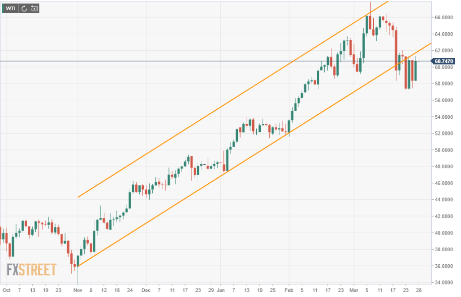 Technically, the plunge on March 18 broke the five-month ascending channel. The attempted return in the next two trading sessions (March 19, 22) failed and the resulting 6.3% drop on March 23 has moved the price sideways. Each of the subsequent three sessions almost exactly reversed the previous day's verdict. The closing rates on the four days tell the story, March 23 open $61.28 close $57.40, March 24 close $61.34, March 25 close $58.34 and March 26 $60.75. The barrel price for WTI is but half-a-dollar from where it was on February 16 $60.24.