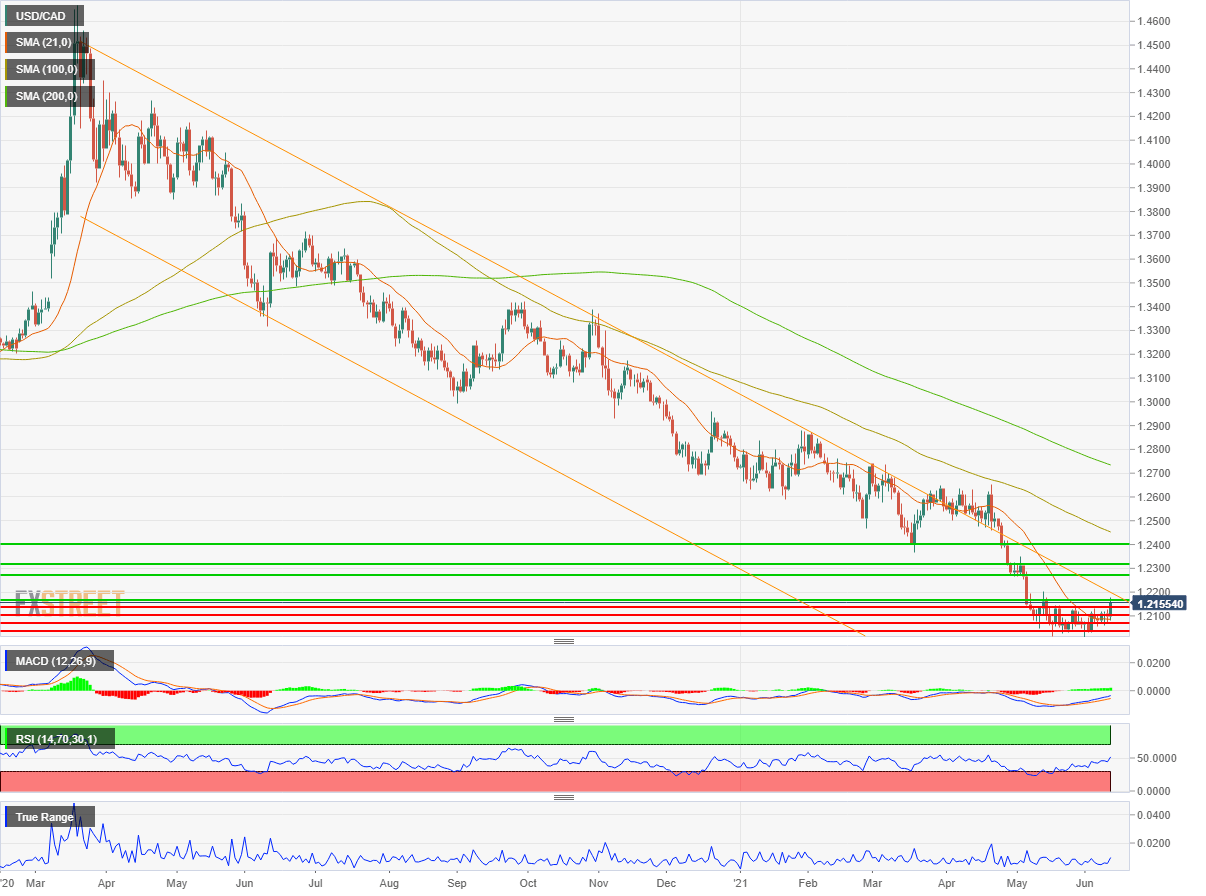 Tuesday's cross of the 21-day moving average (MA) along with an upward bias in the three momentum indicators below gives the USD/CAD a mild case of float starting the week.