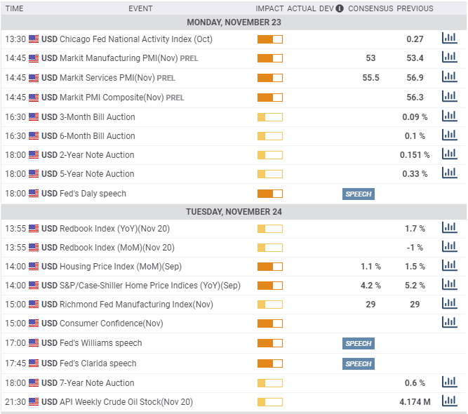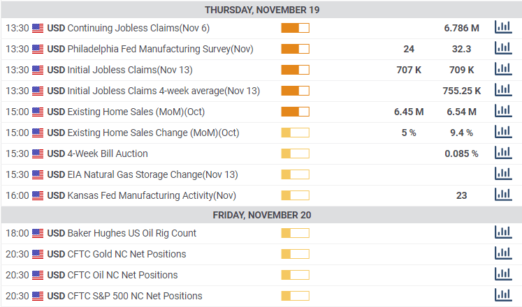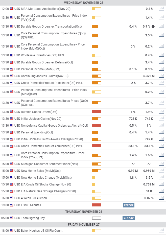 In the slew of US data that arrives on Wednesday, doubled for the Thanksgiving Day holiday that follows on Thursday, Initial Jobless Claims take precedence. Last week's unexpected rise of 31,000 may have been the first notice of a new round of layoffs from the business restrictions imposed in many states or it may be normal variation. If it is seconded by another rise, look for markets to take it out on the dollar.