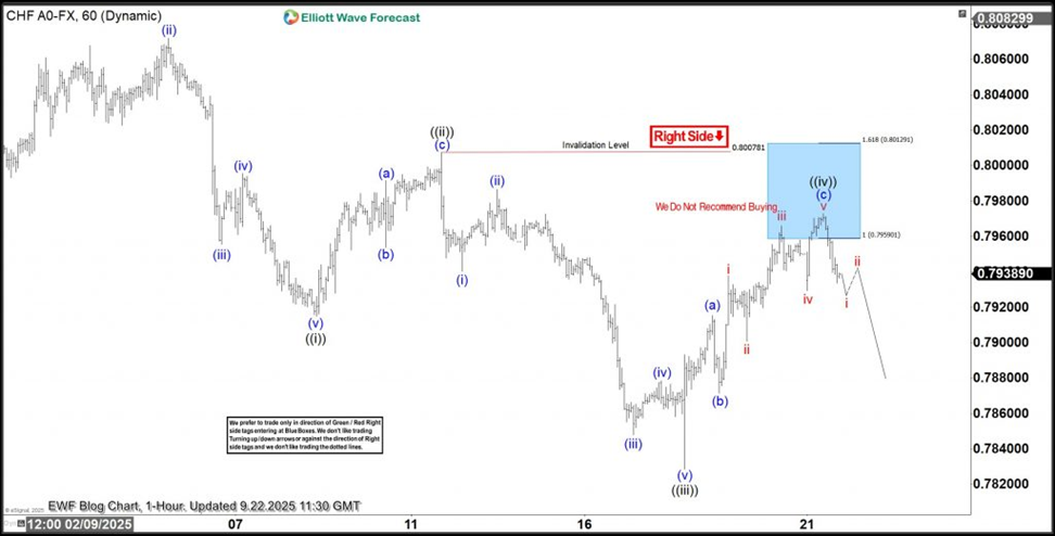 For USDCHF specifically, the bearish cycles began in October 2022 and January 2025. Since January, we have sold bounces at the extremes of 3, 7, or 11 swings. We highlight these extreme zones with blue boxes on our charts. For example, there was a clean 7-swing corrective bounce from July 1, 2025. When that bounce matured, we marked the blue box zone for selling. This setup was shared with members on August 9, 2025. From the August blue box, USDCHF fell over 330 pips. We wrote about it; read here. It even broke below the July low where the bounce started. As a result, we prepared for another corrective bounce to sell from.