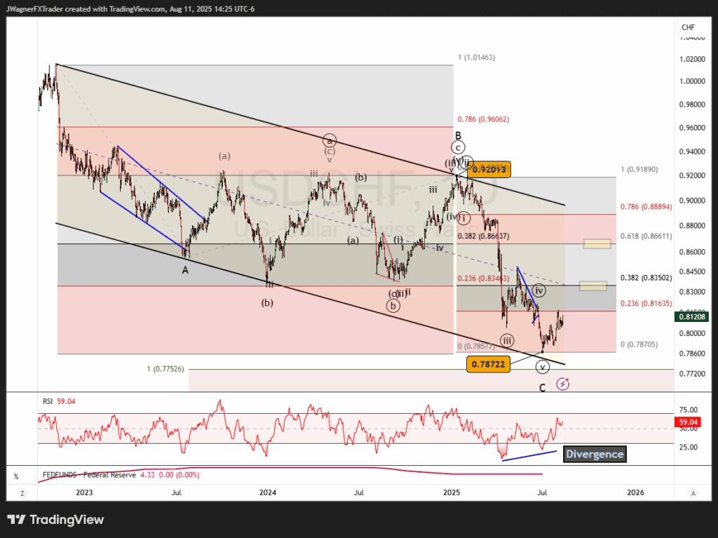 Back in January 2025, we saw symptoms of a top in price and forecasted a decline to .83 and possibly .77. The low on July 1 at .7872 fulfilled that forecast.