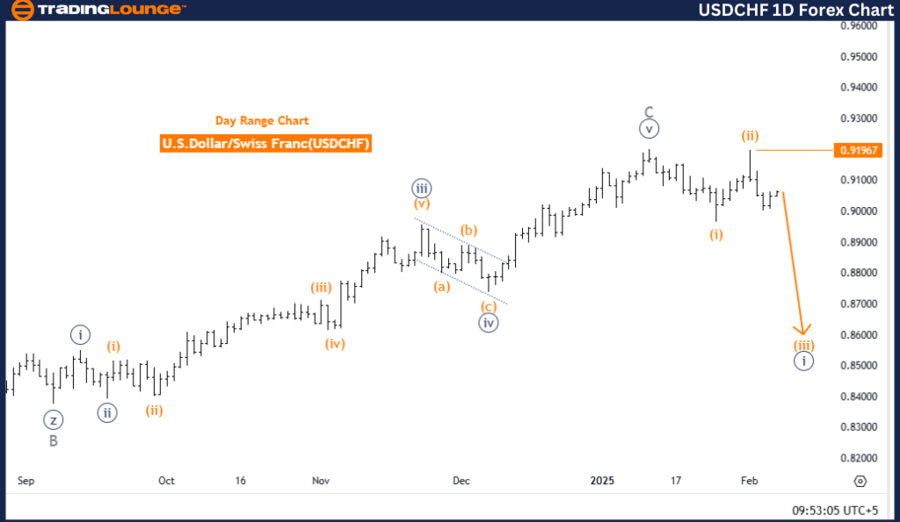 The USDCHF daily chart analysis based on Elliott Wave Theory indicates an ongoing bearish trend in an impulsive phase. The focus is currently on orange wave 3, which has started following the completion of orange wave 2 within navy blue wave 1.