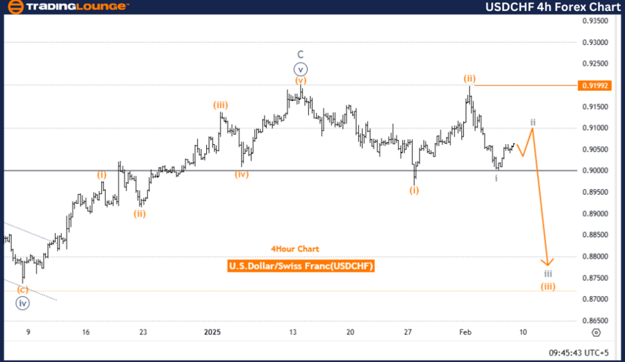 The USDCHF 4-hour chart analysis based on Elliott Wave Theory indicates a counter-trend movement in a corrective phase. The current wave structure revolves around gray wave 2 within orange wave 3, signaling a transitional phase in market dynamics.