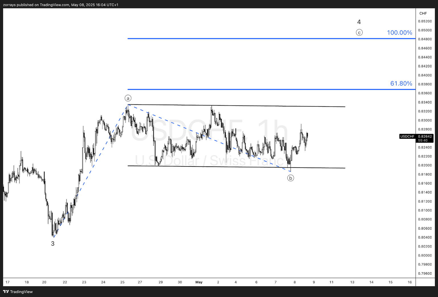 Traders should remain patient and allow the structure to mature, watching closely for any breakout signals. As long as price remains contained below 0.8330, the corrective wave ((b)) could extend further, potentially dragging out the consolidation.