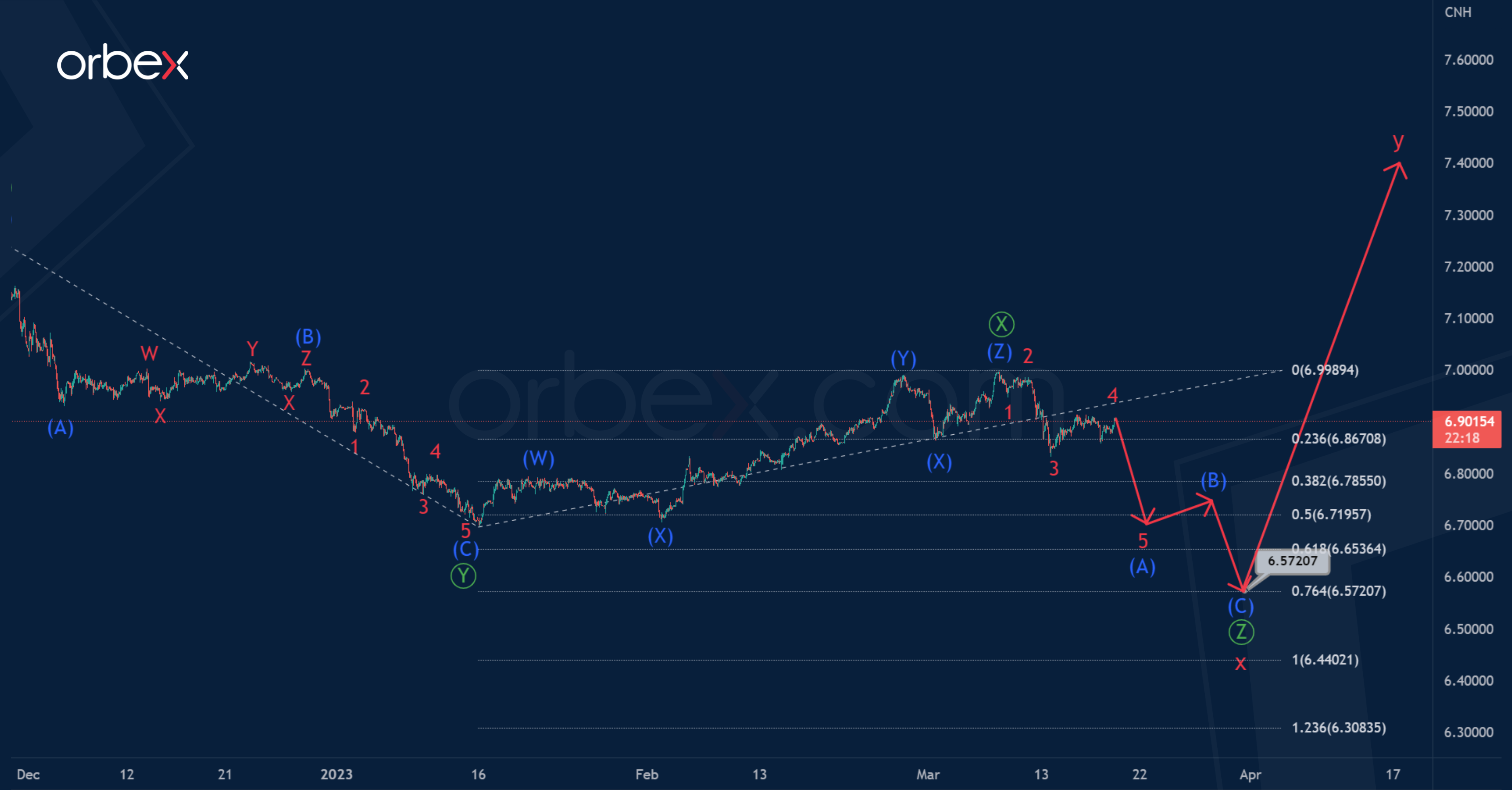 In the long term, the USDCNH pair may build a double zigzag of the cycle degree w-x-y. In February, the bearish intervening wave x, which has the form of a double zigzag Ⓦ-Ⓧ-Ⓨ of the primary degree, ended.