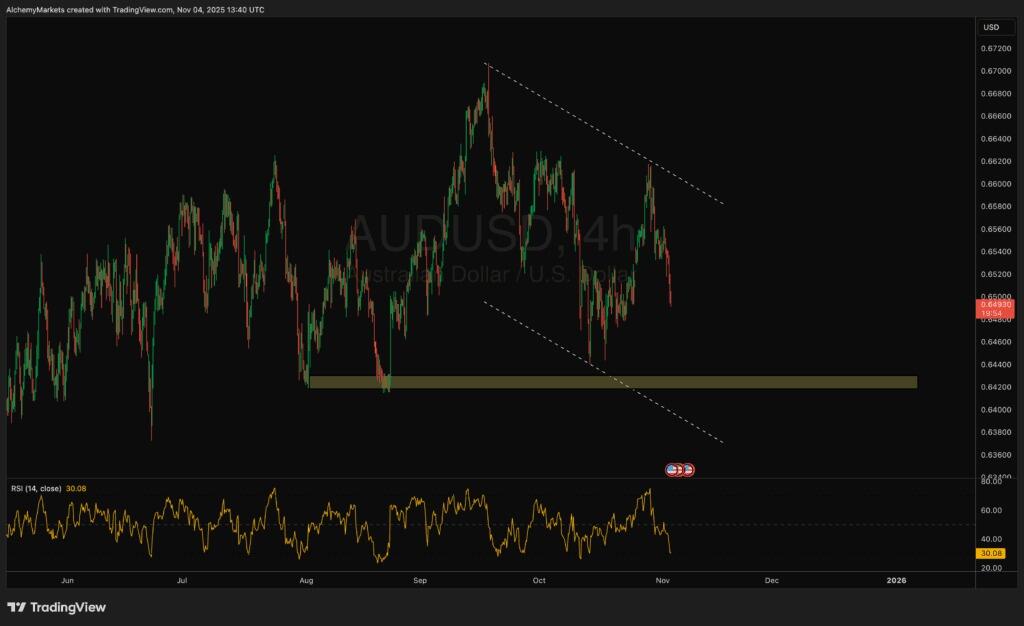 The AUD/USD pair continues to lose momentum, reflecting both a stronger U.S. dollar and ongoing uncertainty surrounding China’s growth outlook. On the chart, the pair trades firmly within a descending channel, with lower highs and lower lows defining its recent structure.