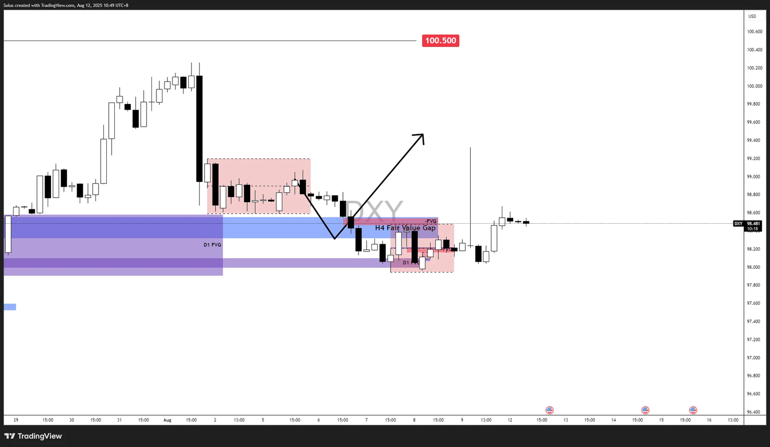 - A break below the D1 FVG low (97.80) opens the path toward 96.40, which is the next significant liquidity pool.