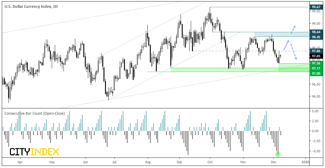 Whilst we remain bullish on USD over the near-term, we’re also mindful of the fact that December is typically bearish for the dollar, so we’ll also be on guard for USD to top out later this month and perhaps print new lows.