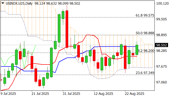 Fresh gains retested falling 100DMA ($98.60), with firm break here and nearby lower top at $98.71 (Aug 22) needed to confirm positive signal and open way for attack at key barrier at $98.88 (daily cloud top / Fibo 50% retracement of $101.80/$95.97 fall).